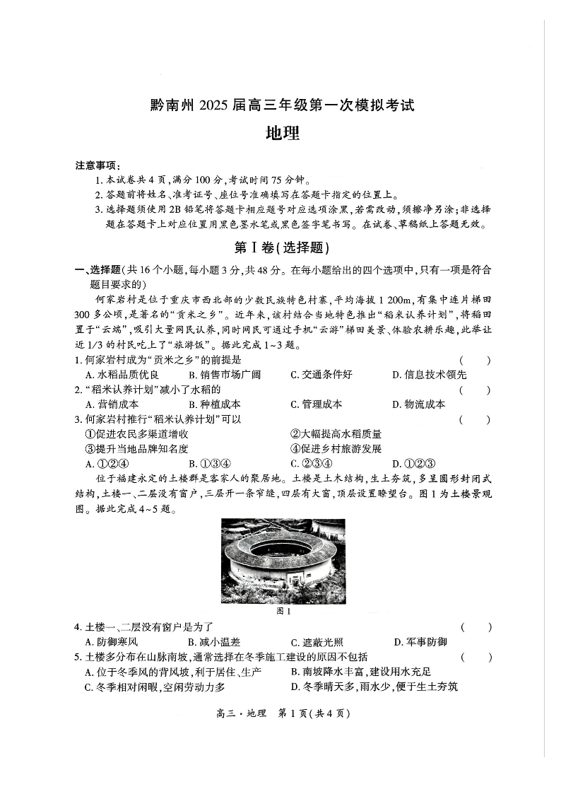 贵州省黔南州2025届高三年级第一次模拟考试地理