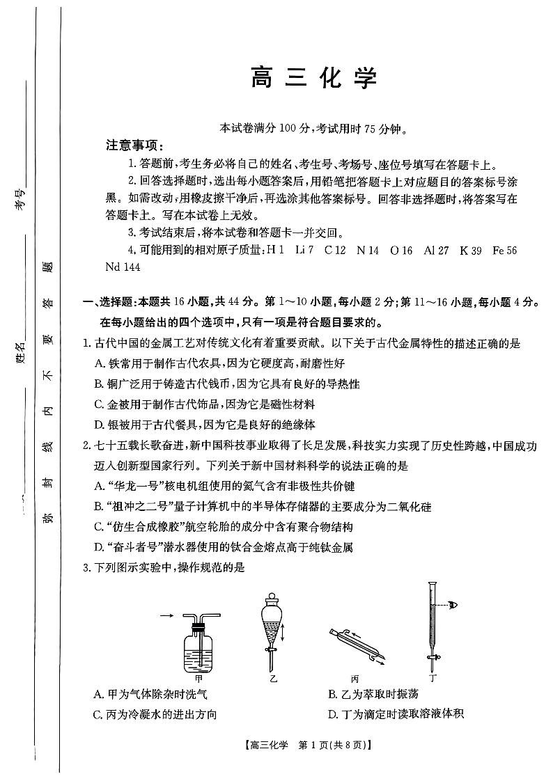 广东省部分高中学校2024-2025学年高三上学期11月期中化学+答案