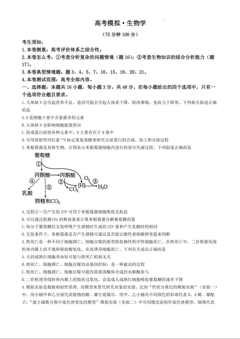 甘肃省2025届高三上学期高考模拟金卷(11月月考)生物+答案