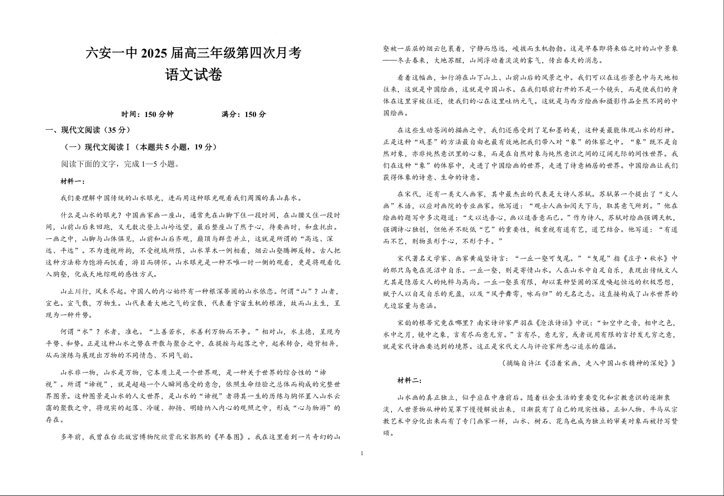 安徽省六安第一中学2025届高三上学期第四次月考语文+答案