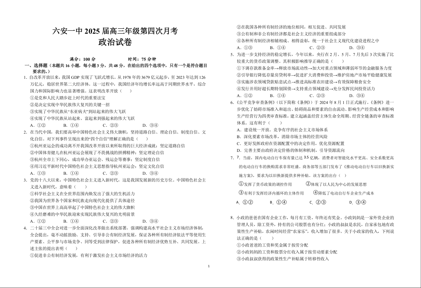 安徽省六安第一中学2025届高三上学期第四次月考政治+答案