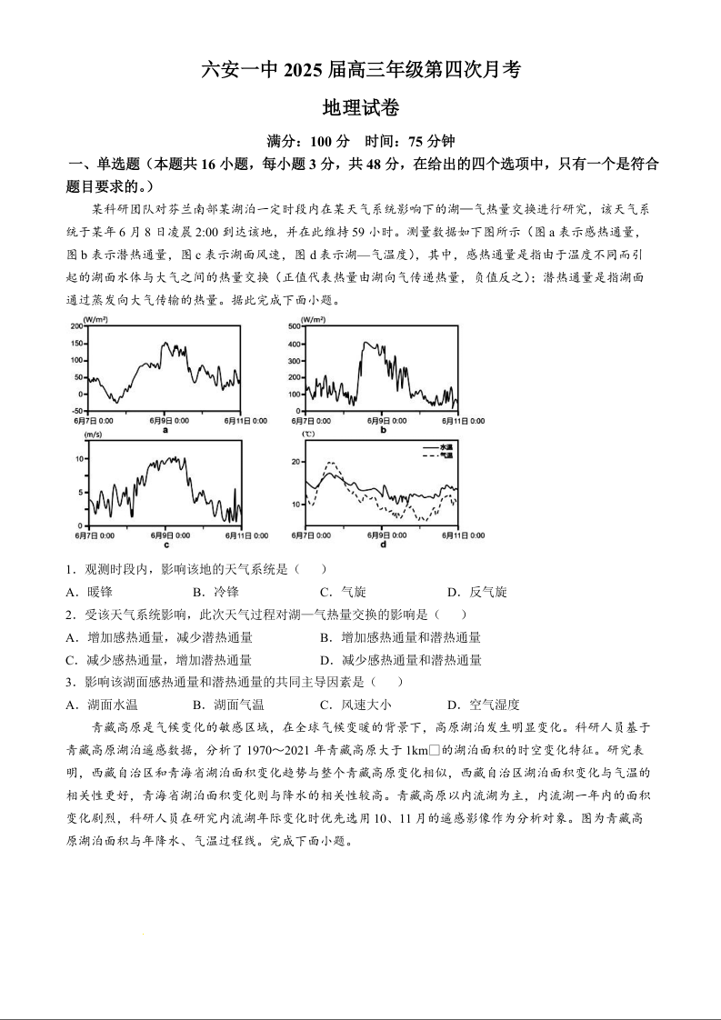 安徽省六安第一中学2025届高三上学期第四次月考地理+答案