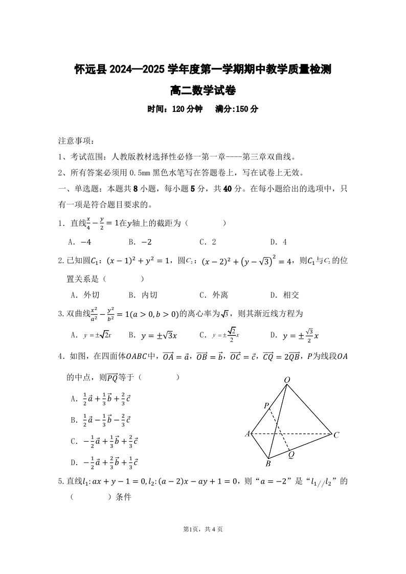 安徽省蚌埠市怀远县2024-2025学年高二上学期11月期中考试数学