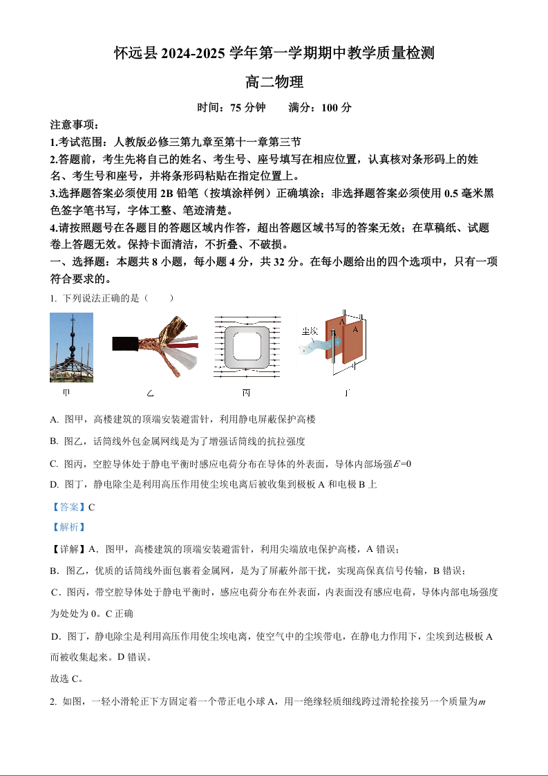 安徽省蚌埠市怀远县2024-2025学年高二上学期11月期中考试物理(精品解析版)