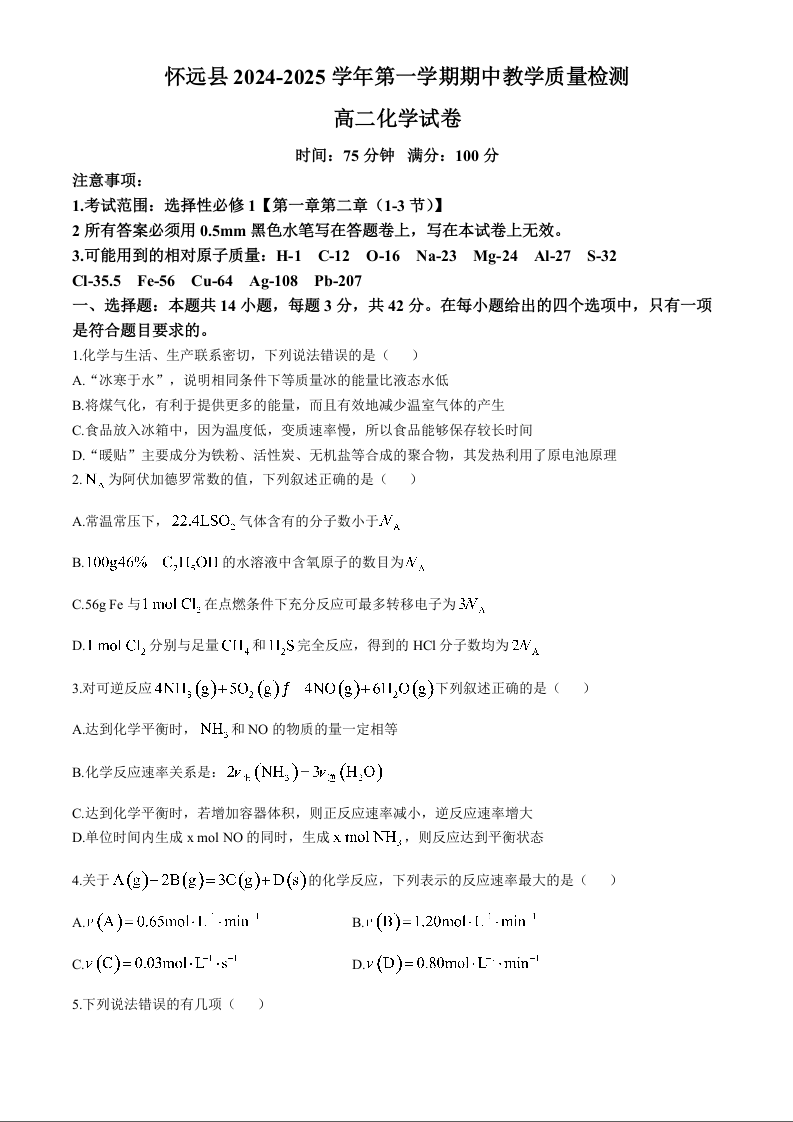 安徽省蚌埠市怀远县2024-2025学年高二上学期11月期中考试化学+答案