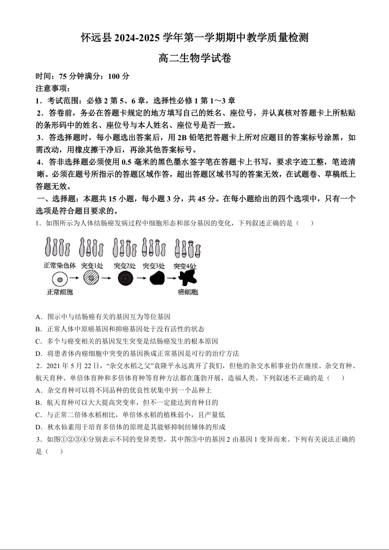 安徽省蚌埠市怀远县2024-2025学年高二上学期11月期中考试生物+答案