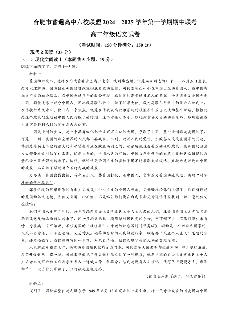 安徽省合肥市六校联盟2024-2025学年高二上学期11月期中联考语文+答案