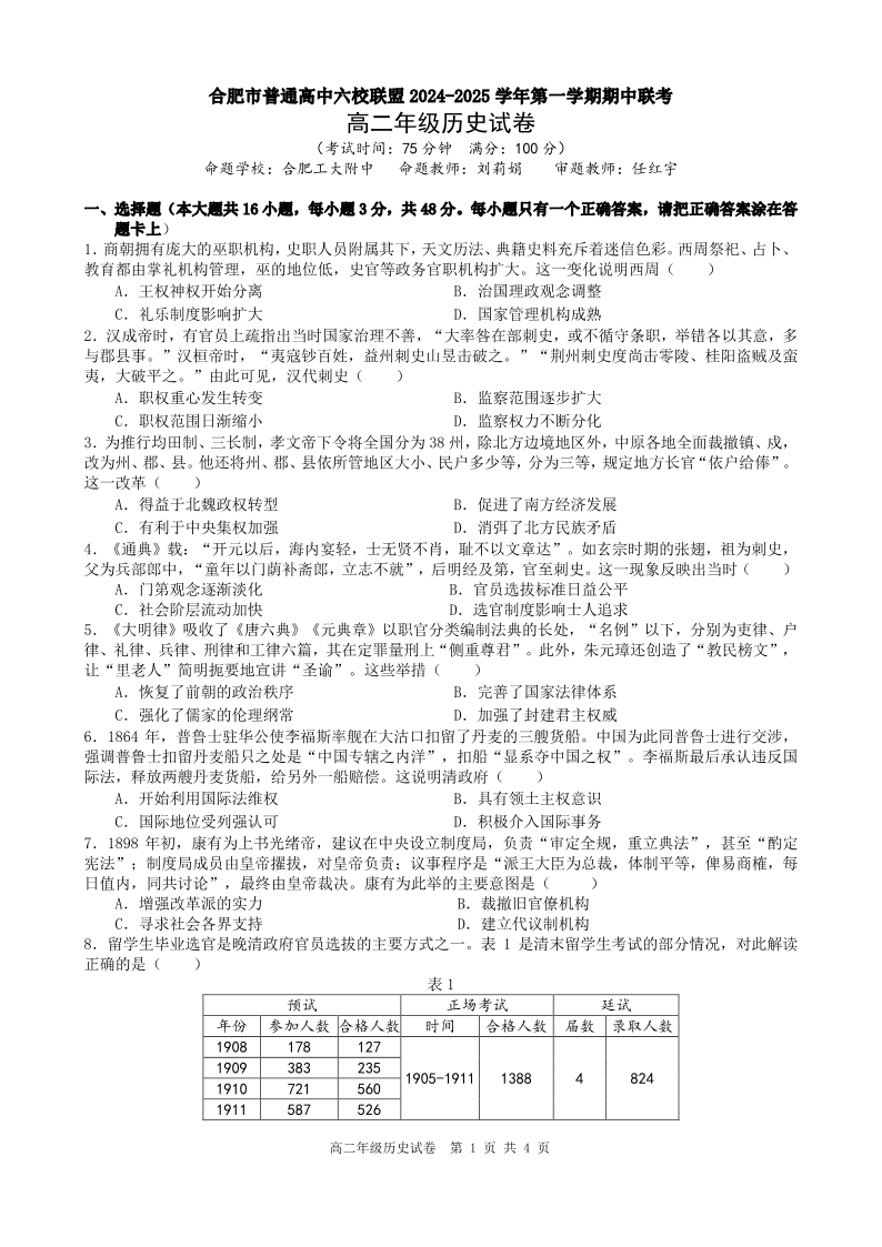 安徽省合肥市六校联盟2024-2025学年高二上学期11月期中联考历史