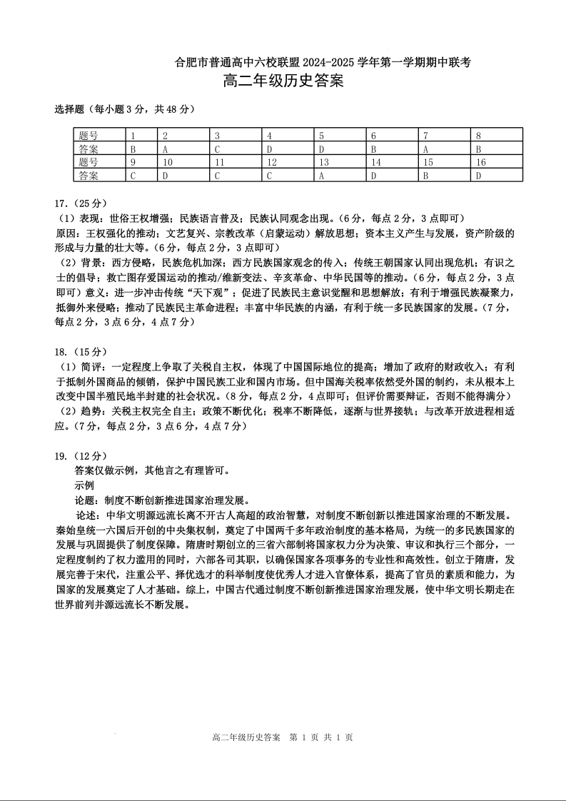 安徽省合肥市六校联盟2024-2025学年高二上学期11月期中联考历史答案