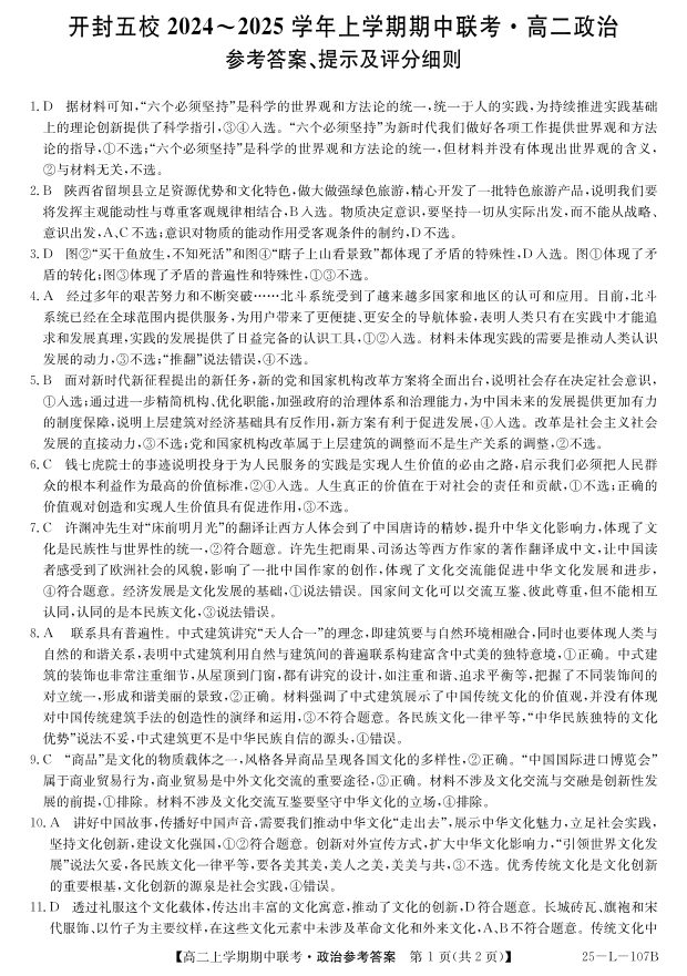 河南省开封市五校2024-2025学年高二上学期11月期中联考政治答案