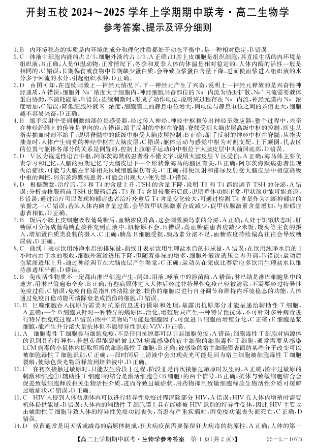 河南省开封市五校2024-2025学年高二上学期11月期中联考生物学答案