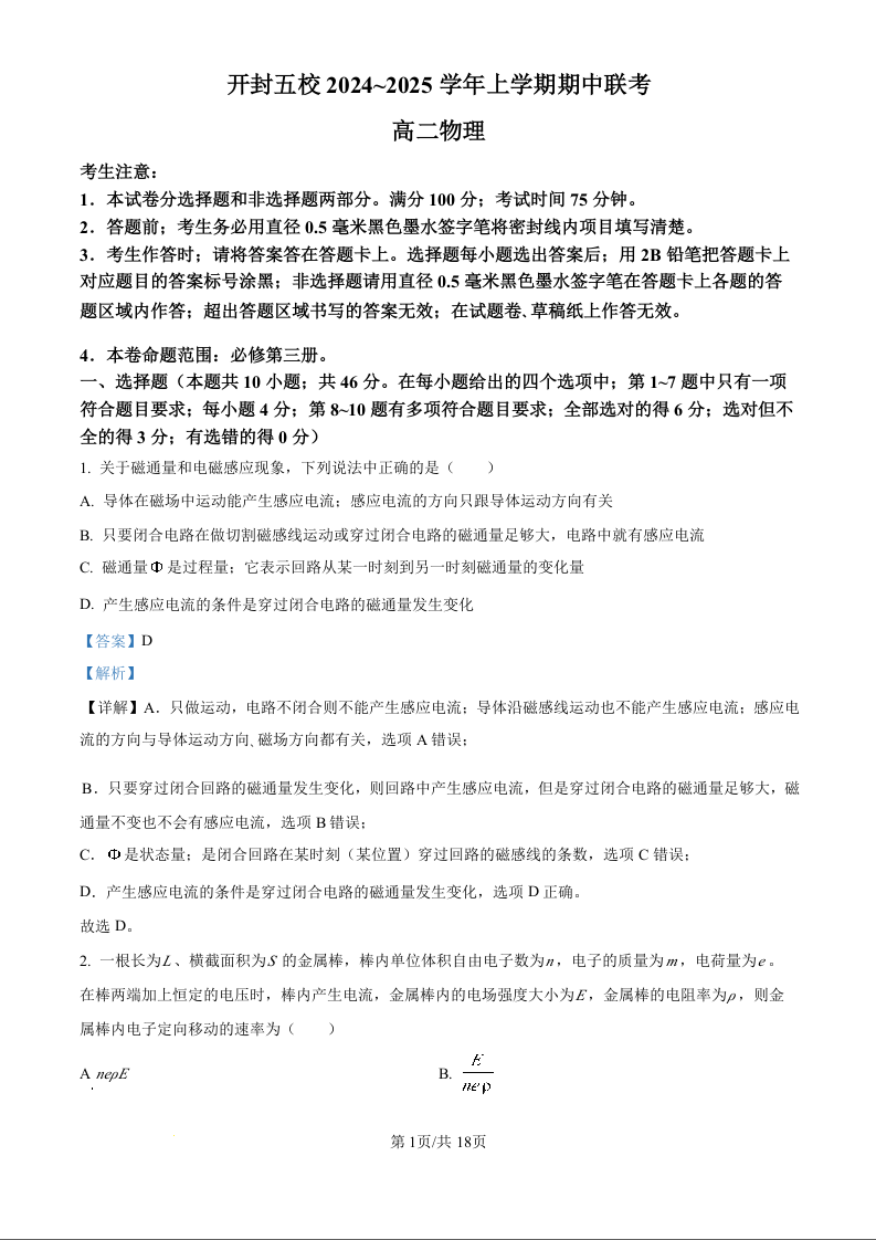 河南省开封市五校2024-2025学年高二上学期11月期中联考物理(精品解析版)