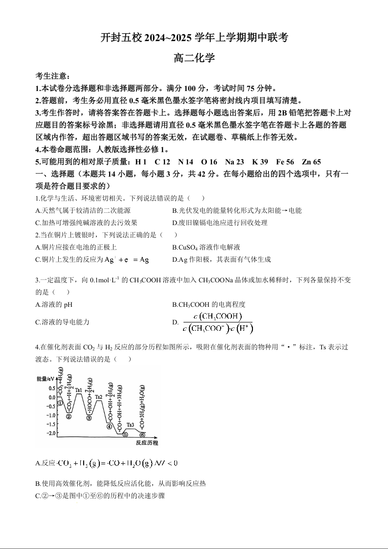 河南省开封市五校2024-2025学年高二上学期11月期中联考化学+答案