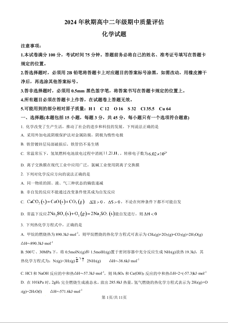 河南省南阳市2024-2025学年高二上学期11月期中考试化学(原卷版)