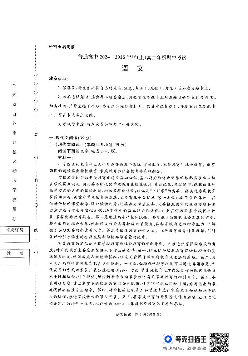 河南省普通高中2024-2025学年高二上学期期中考试语文PDF版含解析