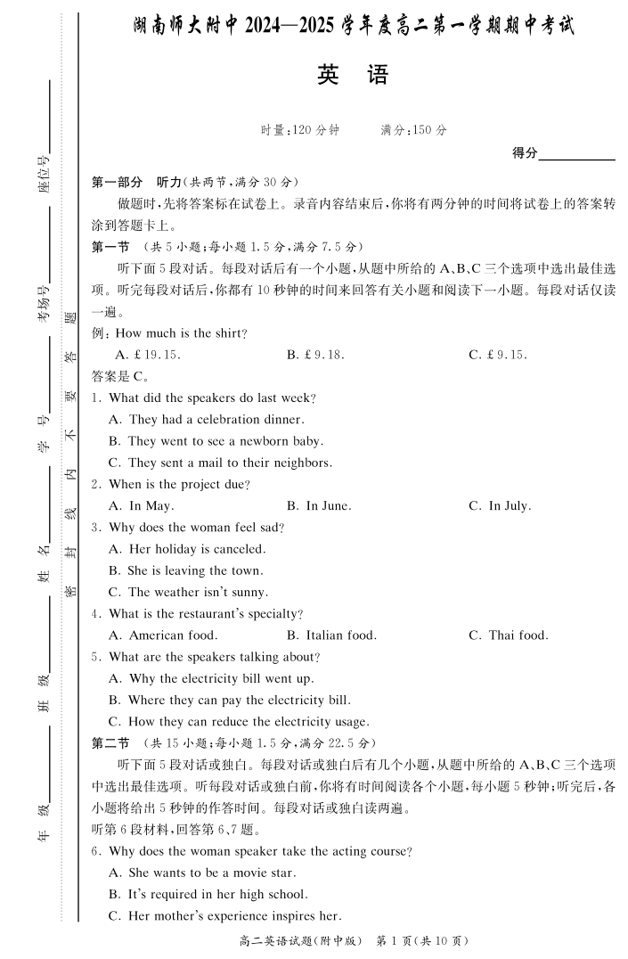 湖南省师范大学附属中学2024-2025学年高二上学期11月期中考试英语