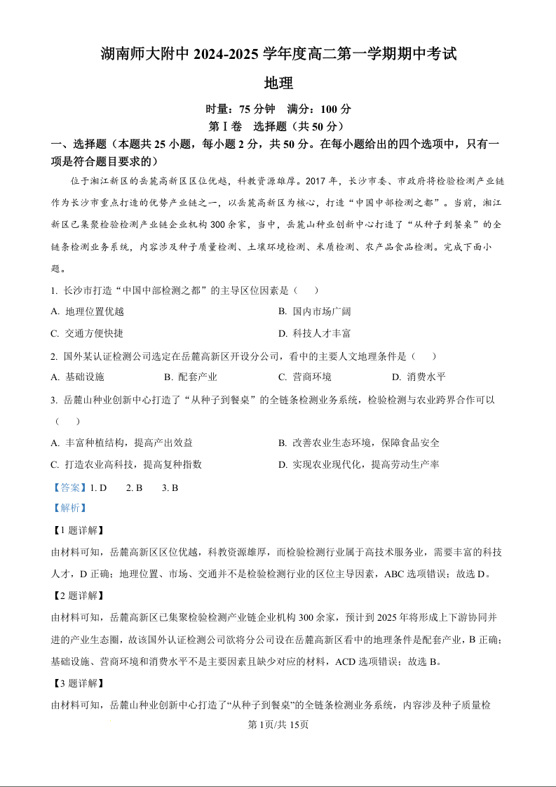 湖南省师范大学附属中学2024-2025学年高二上学期11月期中考试地理(精品解析版)