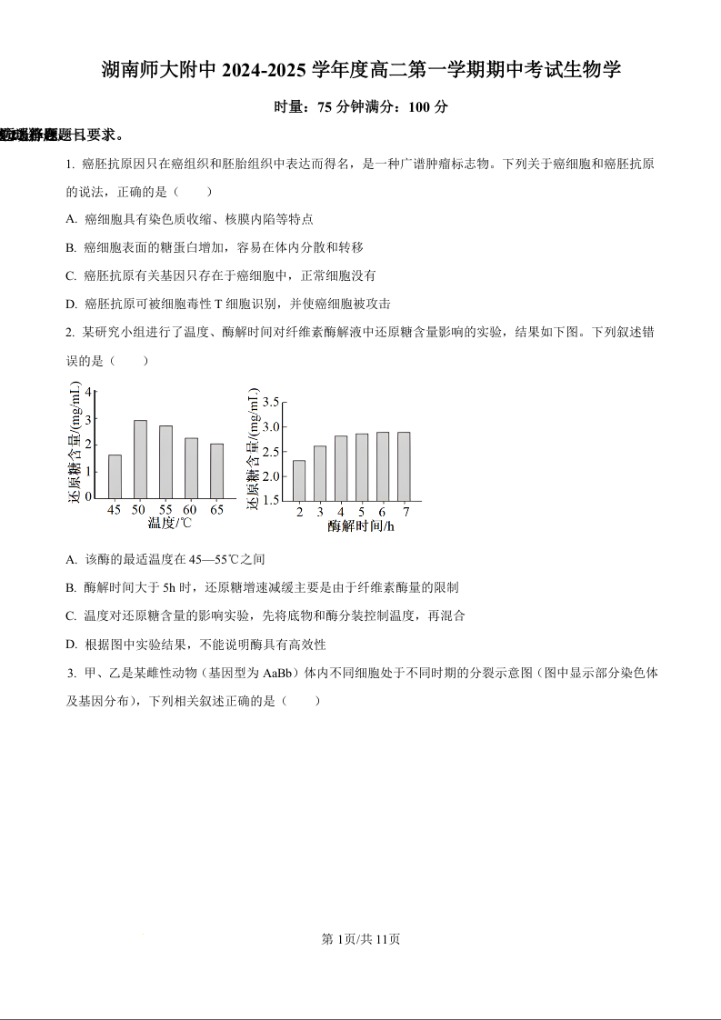 湖南省师范大学附属中学2024-2025学年高二上学期11月期中考试生物(原卷版)
