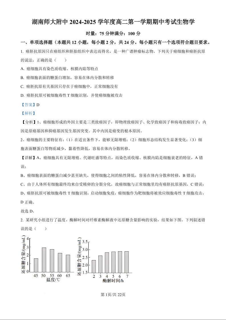 湖南省师范大学附属中学2024-2025学年高二上学期11月期中考试生物(精品解析版)