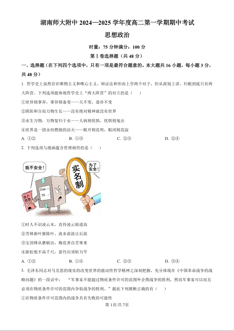 湖南省师范大学附属中学2024-2025学年高二上学期11月期中考试政治(原卷版)