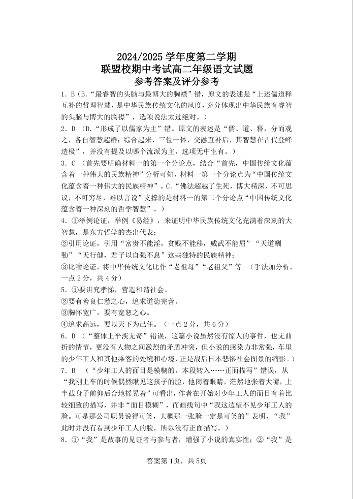 江苏省盐城市五校联考2024-2025学年高二上学期11月期中考试语文答案