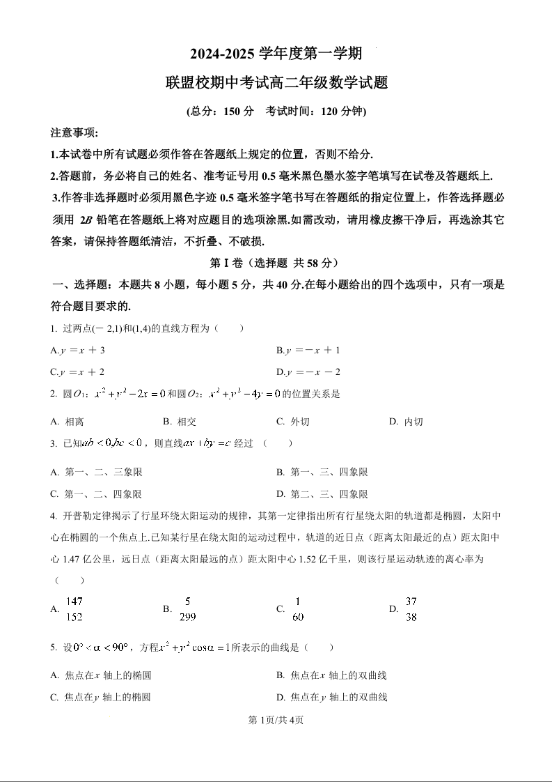 江苏省盐城市五校联考2024-2025学年高二上学期11月期中考试数学(原卷版)