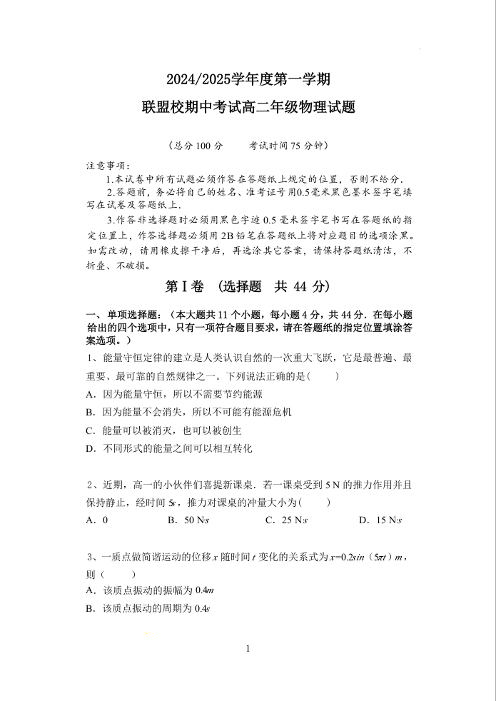 江苏省盐城市五校联考2024-2025学年高二上学期11月期中考试试题物理