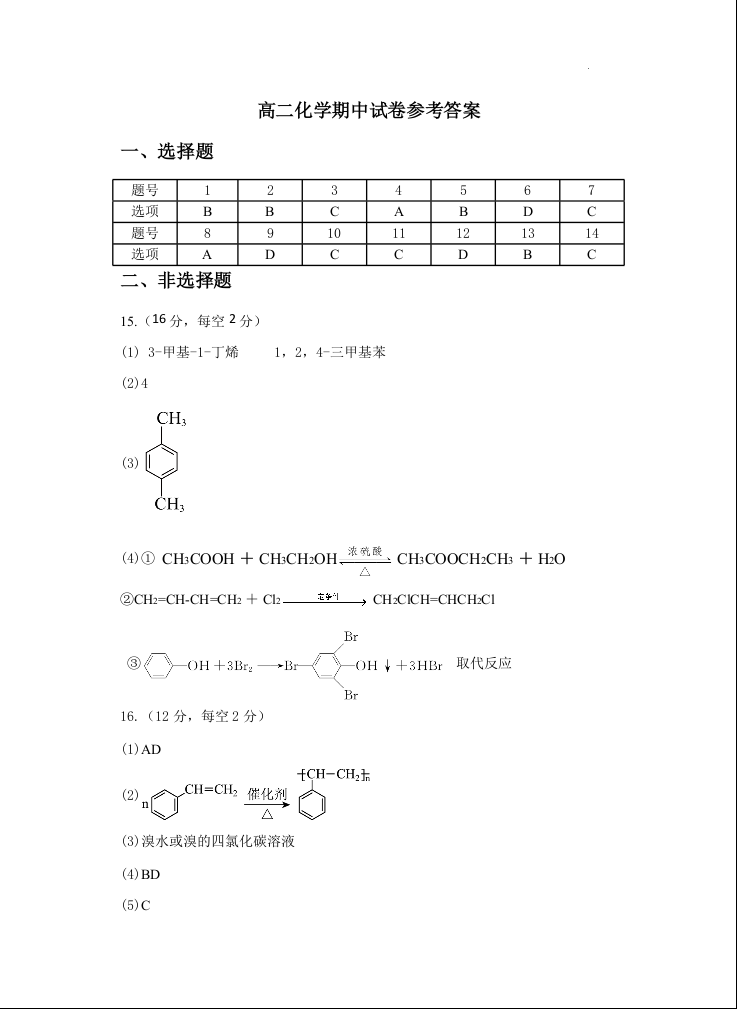 江苏省盐城市五校联考2024-2025学年高二上学期11月期中考试试题化学答案