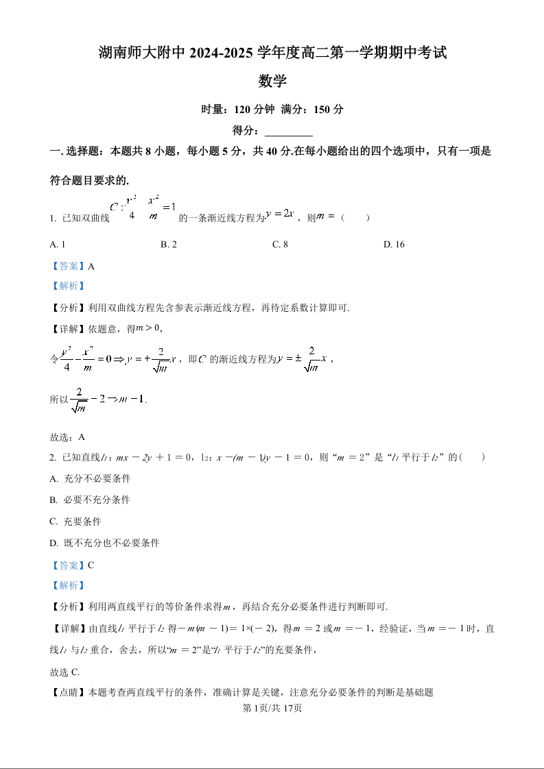 湖南省师范大学附属中学2024-2025学年高二上学期11月期中考试数学(精品解析版)