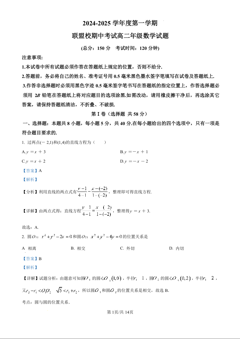江苏省盐城市五校联考2024-2025学年高二上学期11月期中考试数学(精品解析版)