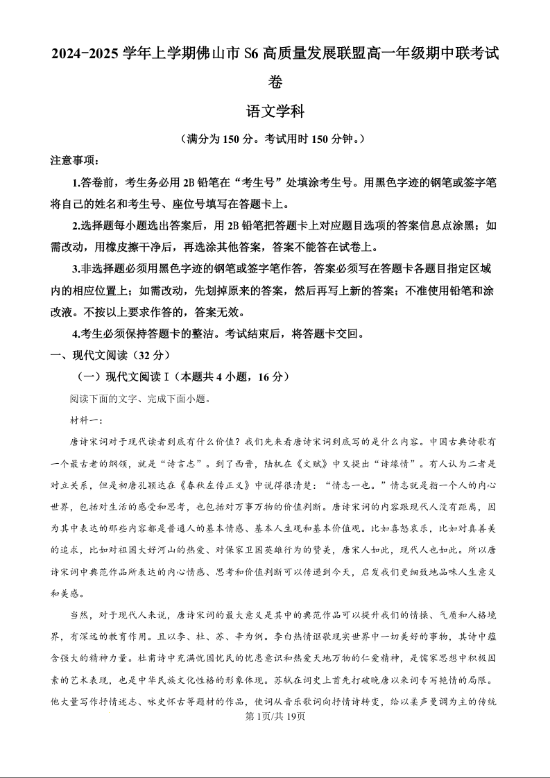 广东省佛山市S6高质量发展联盟2024-2025学年高一上学期期中联考语文(精品解析版)