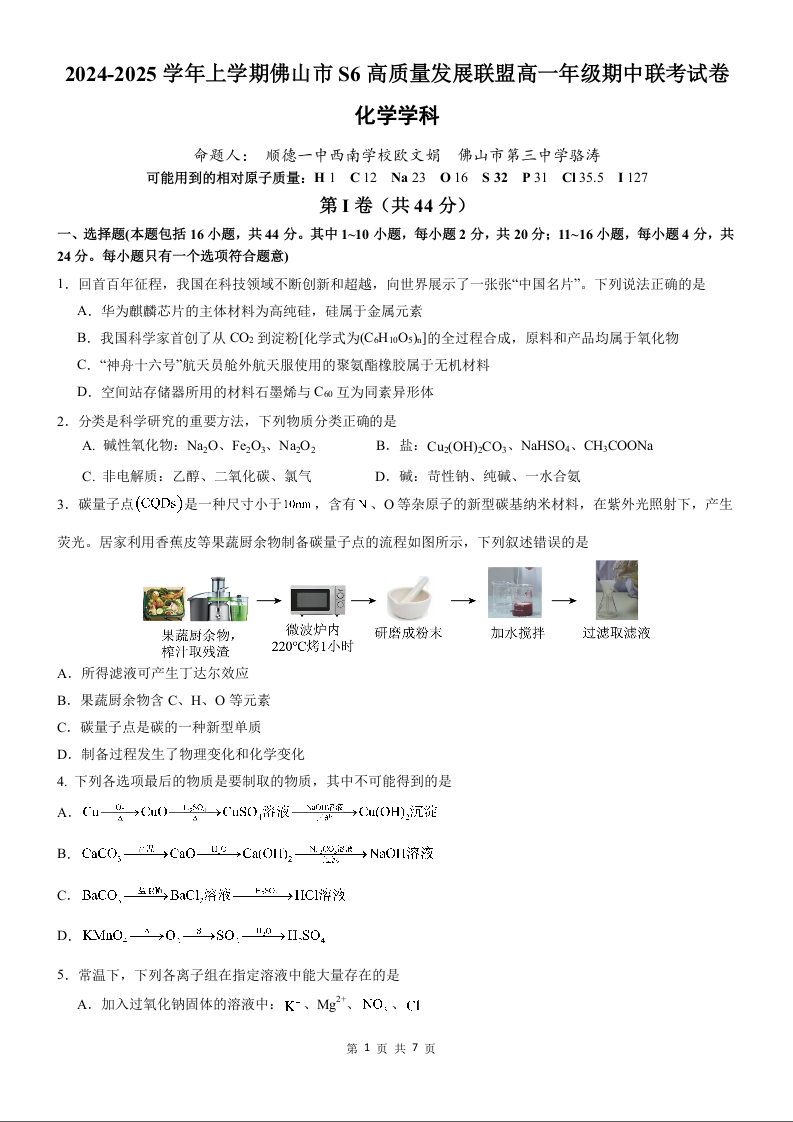 广东省佛山市S6高质量发展联盟2024-2025学年高一上学期期中联考化学