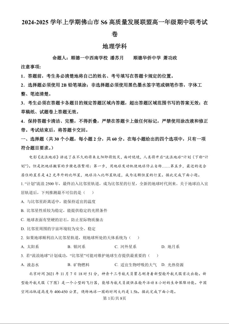 广东省佛山市S6高质量发展联盟2024-2025学年高一上学期期中联考地理(原卷版)