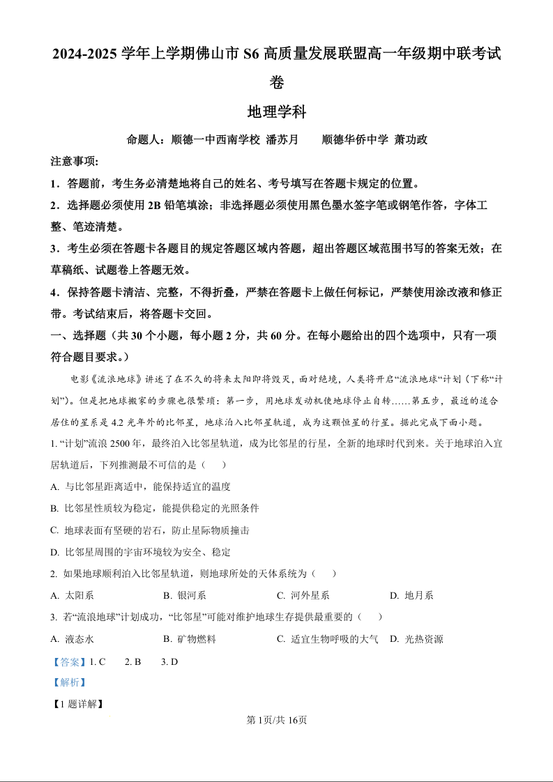 广东省佛山市S6高质量发展联盟2024-2025学年高一上学期期中联考地理(精品解析版)