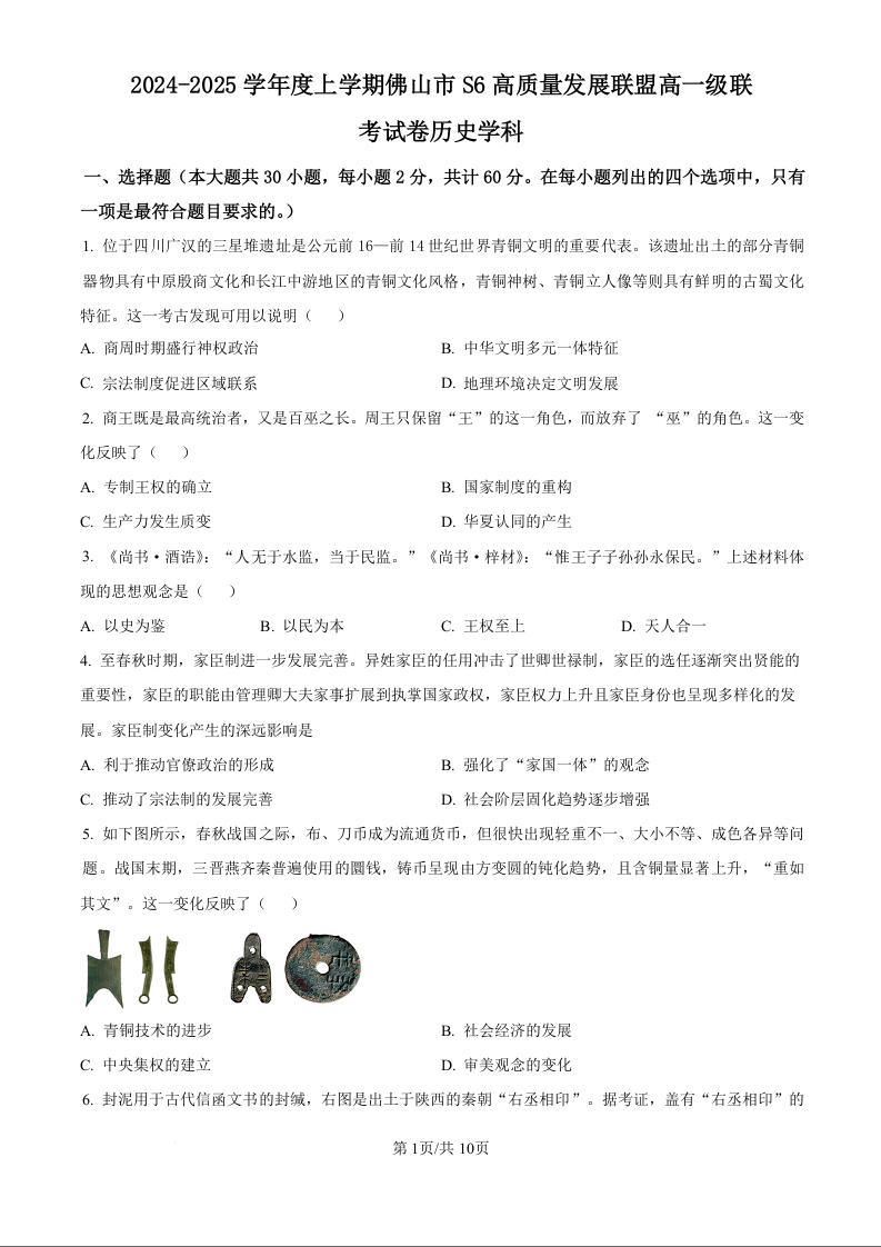 广东省佛山市S6高质量发展联盟2024-2025学年高一上学期期中联考历史(原卷版)