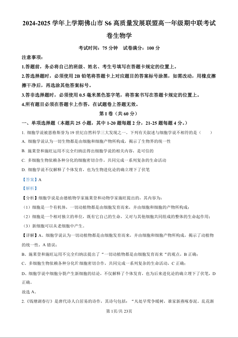 广东省佛山市S6高质量发展联盟2024-2025学年高一上学期期中联考生物(精品解析版)