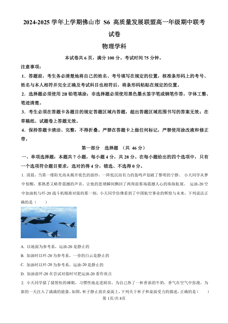 广东省佛山市S6高质量发展联盟2024-2025学年高一上学期期中联考物理(原卷版)