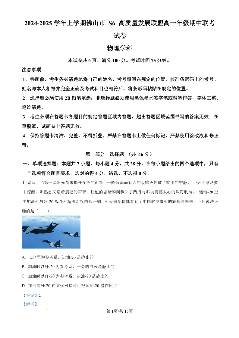 广东省佛山市S6高质量发展联盟2024-2025学年高一上学期期中联考物理(精品解析版)
