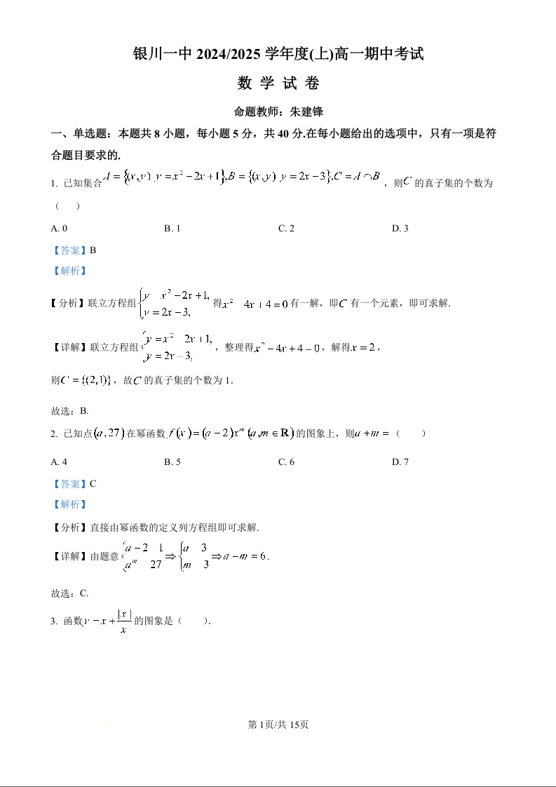 宁夏回族自治区银川一中2024-2025学年高一上学期期中考试数学(精品解析版)