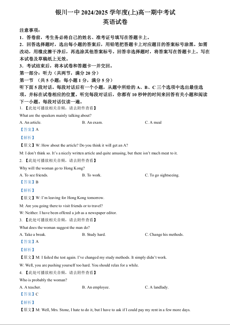 宁夏回族自治区银川一中2024-2025学年高一上学期期中考试英语(精品解析版)