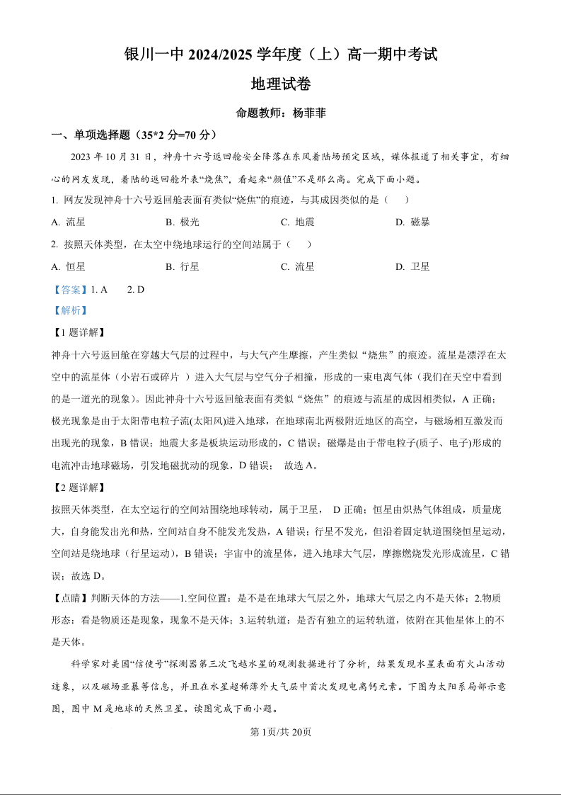 宁夏回族自治区银川一中2024-2025学年高一上学期期中考试地理(精品解析版)