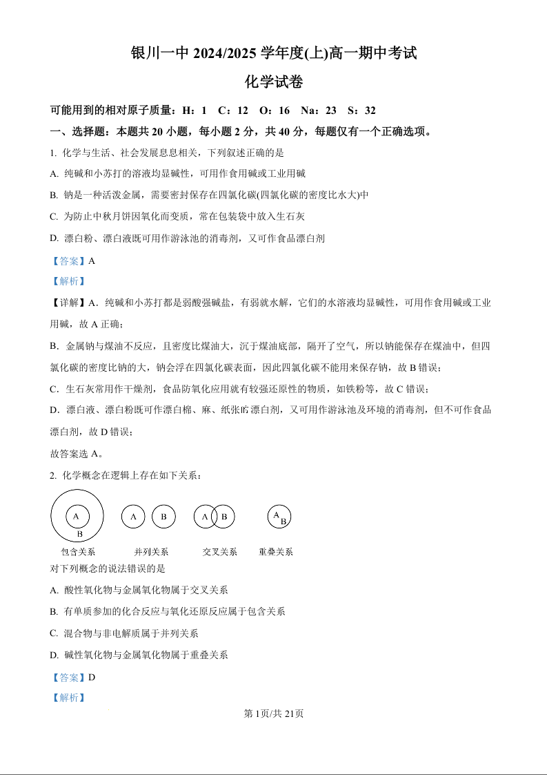 宁夏回族自治区银川一中2024-2025学年高一上学期期中考试化学(精品解析版)