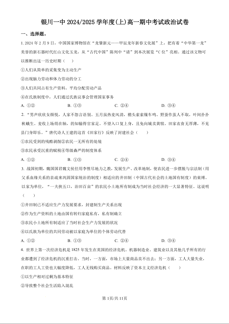 宁夏回族自治区银川一中2024-2025学年高一上学期期中考试政治(原卷版)
