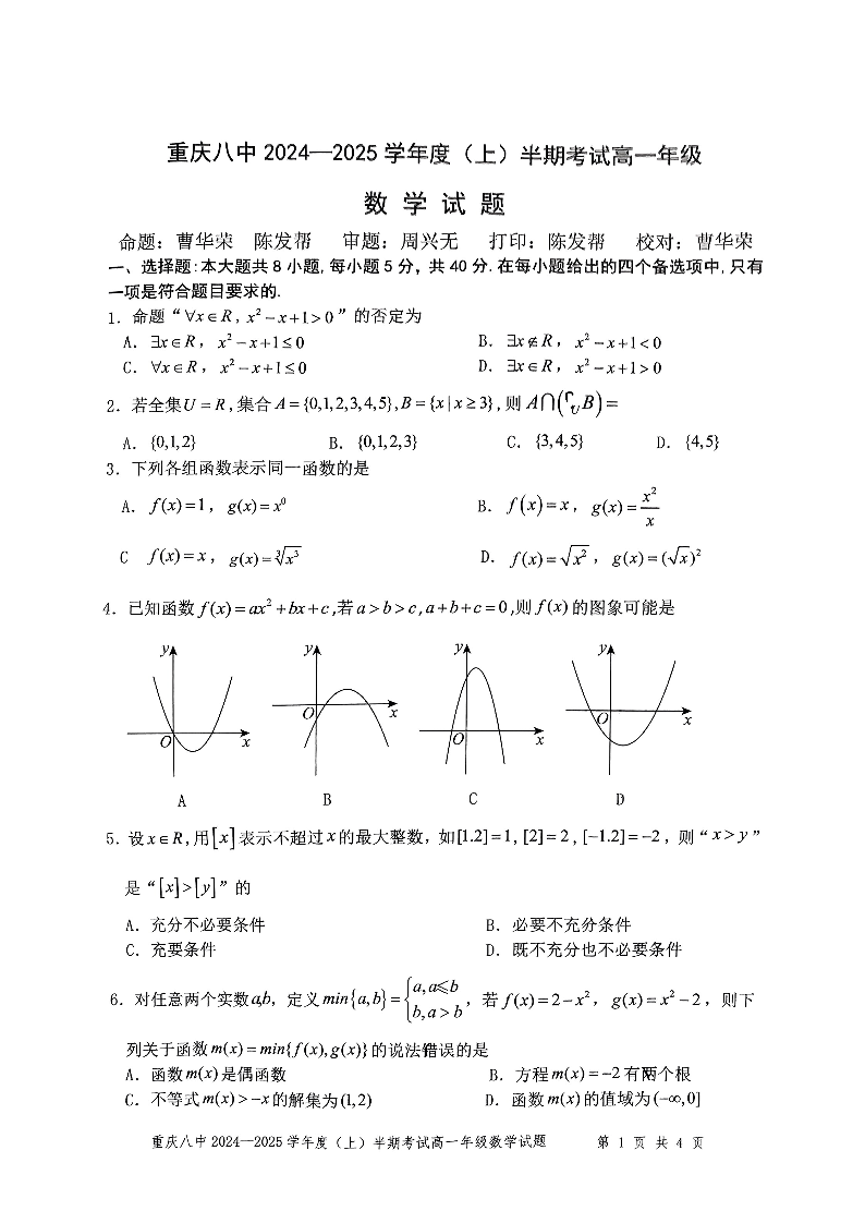 重庆市第八中学校2024-2025学年11月高一上学期期中考试数学