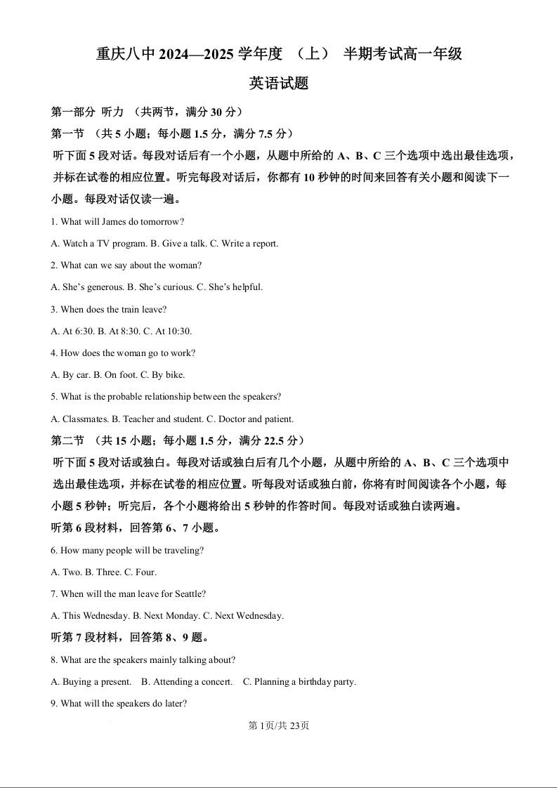 重庆市第八中学校2024-2025学年11月高一上学期期中考试英语(精品解析版)