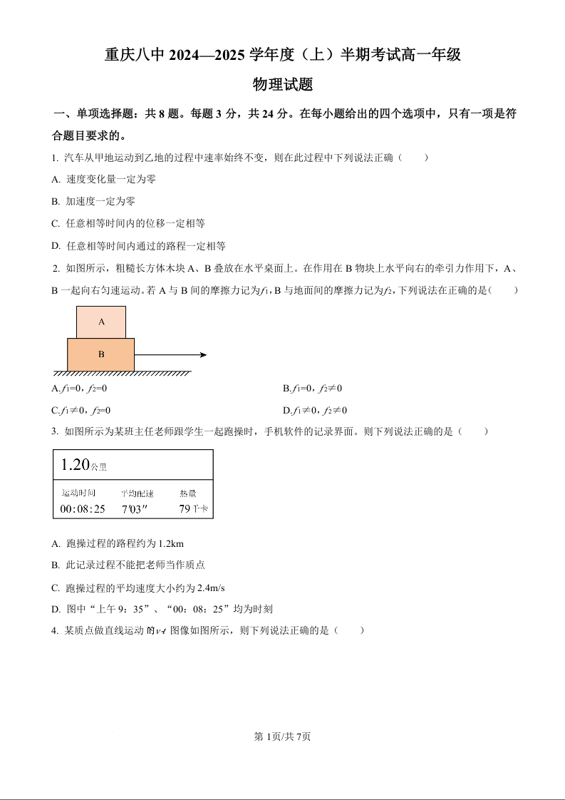 重庆市第八中学校2024-2025学年11月高一上学期期中考试物理(原卷版)