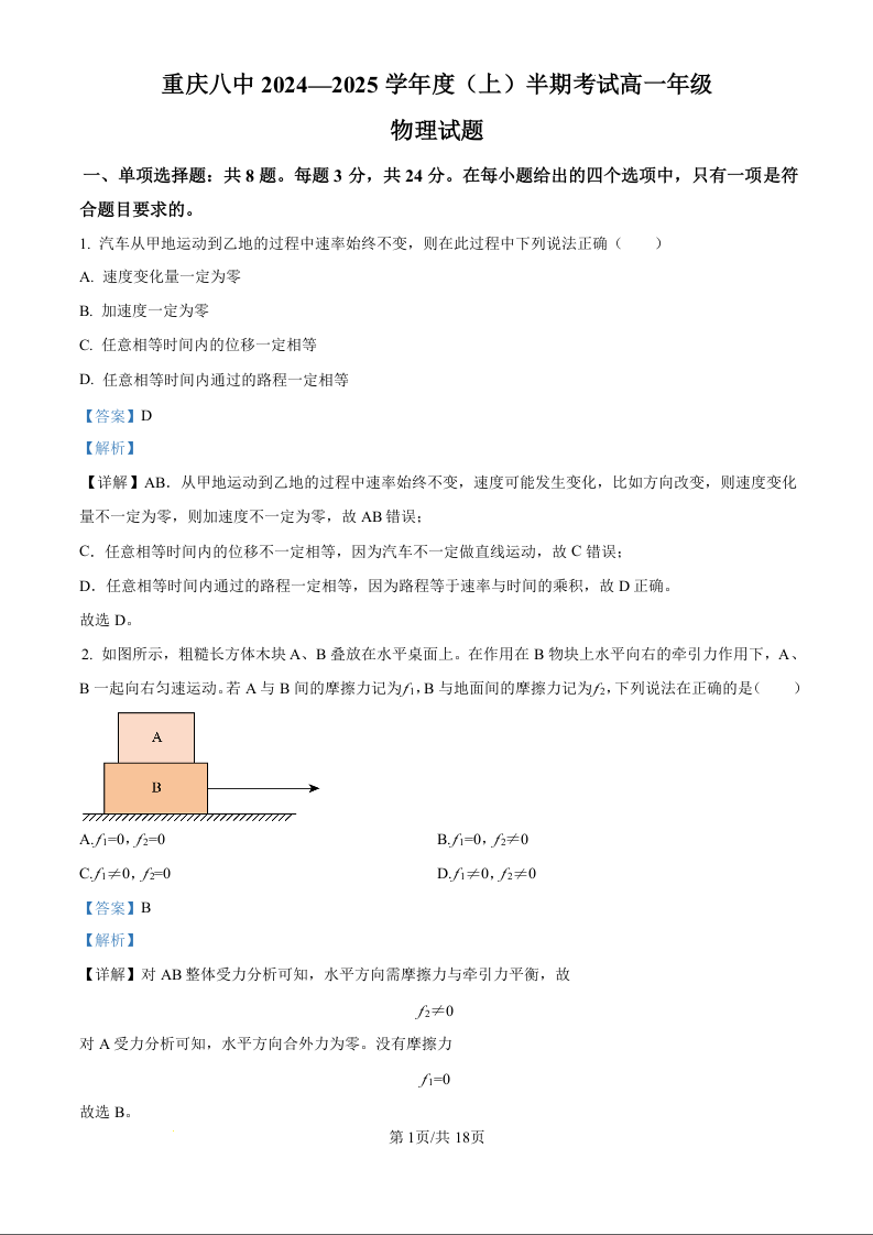 重庆市第八中学校2024-2025学年11月高一上学期期中考试物理(精品解析版)