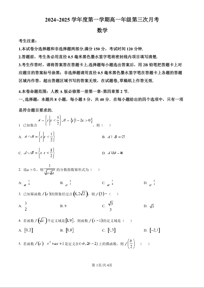 河北省沧州市四县联考2024-2025学年高一上学期11月月考数学(原卷版)