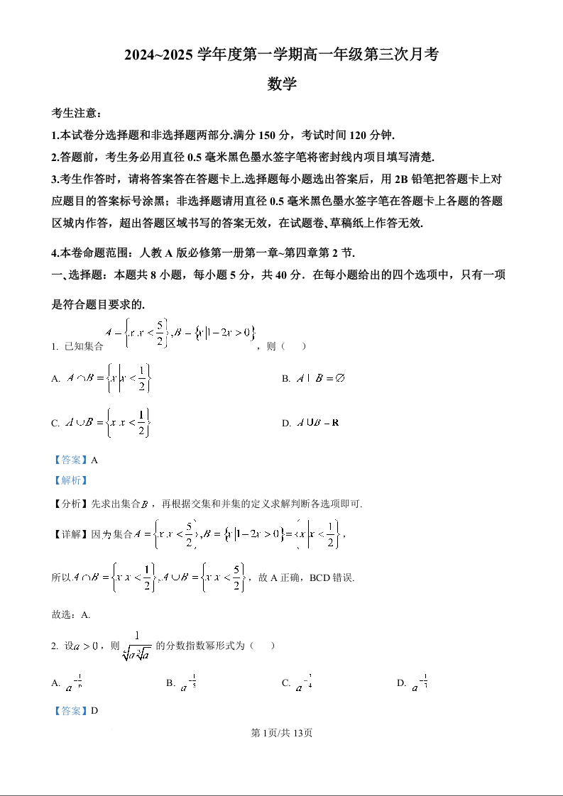 河北省沧州市四县联考2024-2025学年高一上学期11月月考数学(精品解析版)
