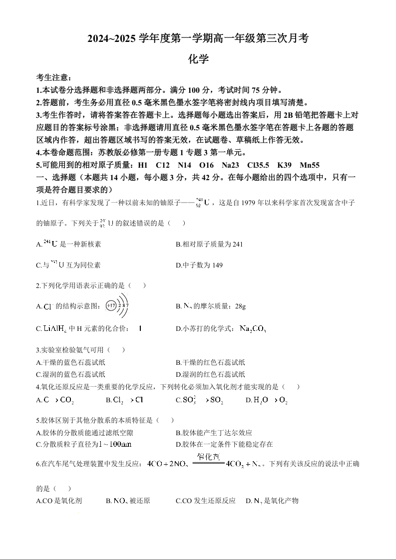 河北省沧州市四县联考2024-2025学年高一上学期11月月考化学+答案